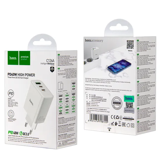 Сетевое зарядное устройство C126A на USB QC3.0 + 2 Type-C PD40W HOCO белый
